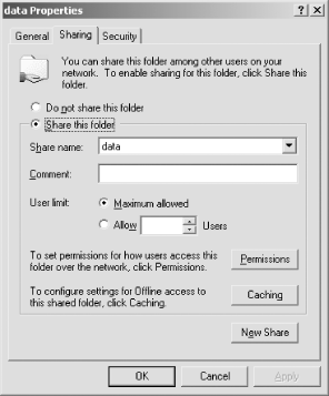 To create a file share on Windows NT/2000/XP, you first must log in to the system as any member of the Administrators, Power Users, or Server Operators groups. Right-click the icon of a folder you wish to share, and click Sharing . . . in the pop-up menu. The Sharing tab of the folder's Properties dialog box will appear, as shown in Figure 5-4. Click the "Share this folder" radio button.