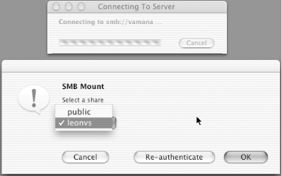 You can specify a server, share, workgroup, username, and password (optionally encrypted with smbutil crypt) in the URI, in the same format as the UNC argument to mount_smbfs. If you don't specify a share name in the URI, you will be shown a window that lets you choose from a list of shares available to mount. See Figure 5-6.